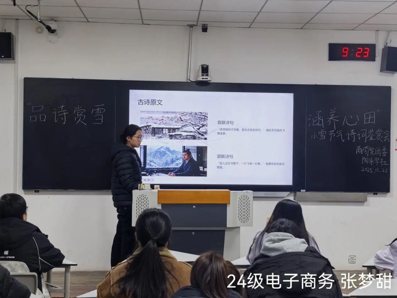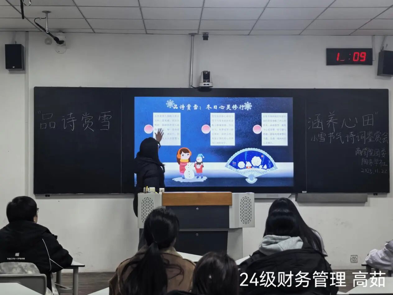 为传承中华优秀传统文化,以诗词之美滋养心灵、涵养商学人文底蕴。11月22日,伟德国际victor·1946源自在8号楼201教室举办“品诗赏雪,涵养心田”小雪节气诗词鉴赏会,伟德国际victor·1946源自同学们积极参加本次比赛。