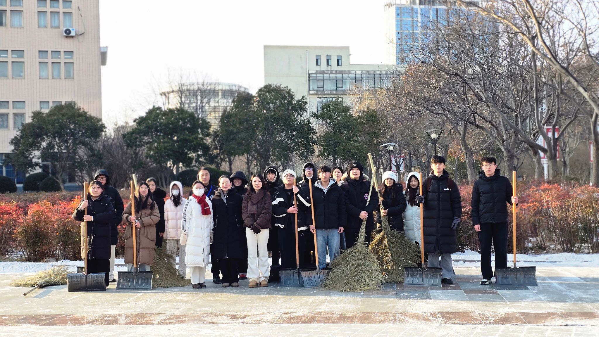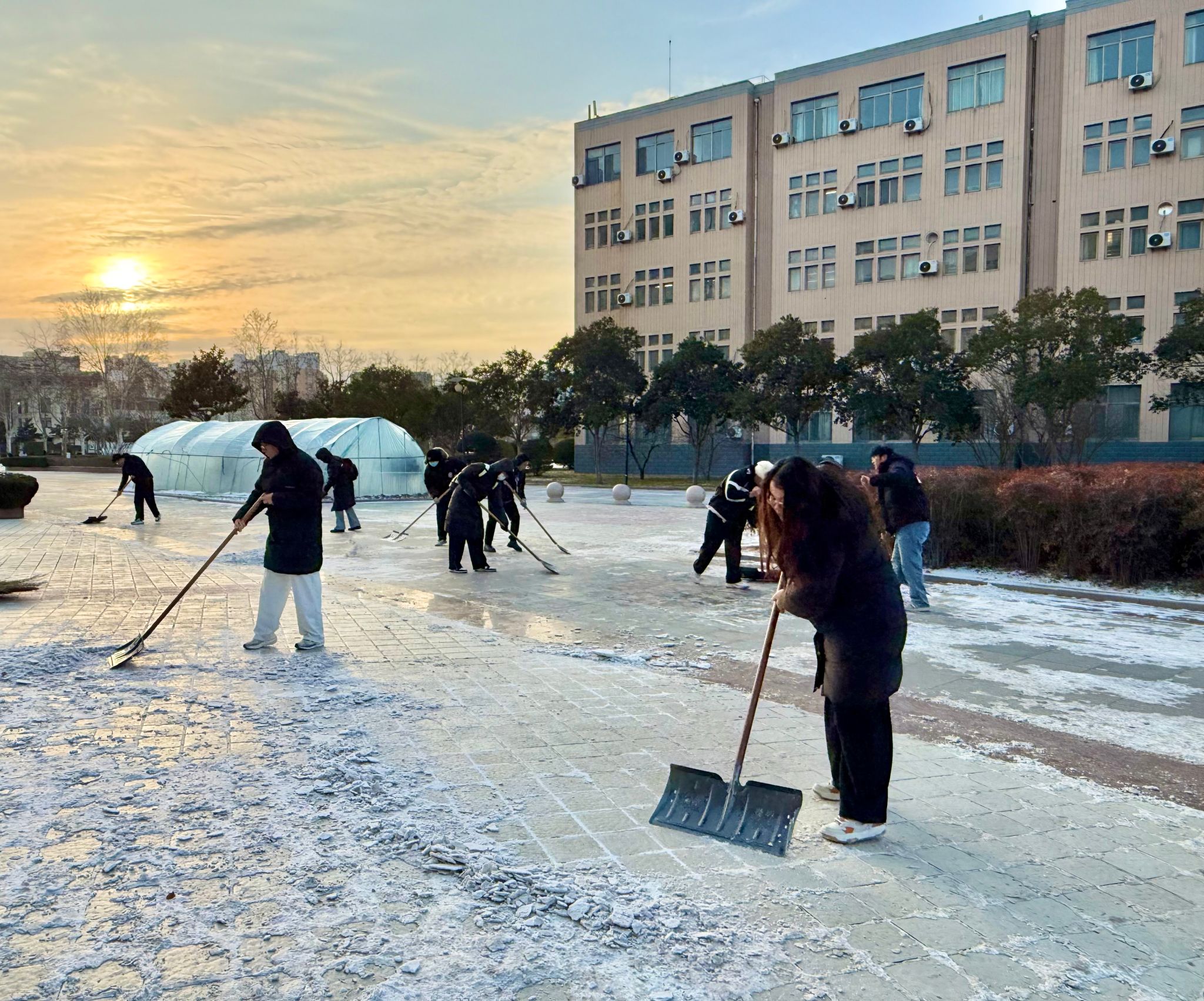 本次活动志愿者们手持铁锹、扫帚等工具,对教学楼前主干道、台阶及坡道等易滑区域的积雪积冰进行了全面清理。大家分工协作,铲冰、扫雪、清运配合默契,尽管寒风凛冽、手套冻僵,仍干劲十足。路过的师生纷纷为志愿者们点赞,不少备考的同学也主动加入队伍,现场气氛热烈。