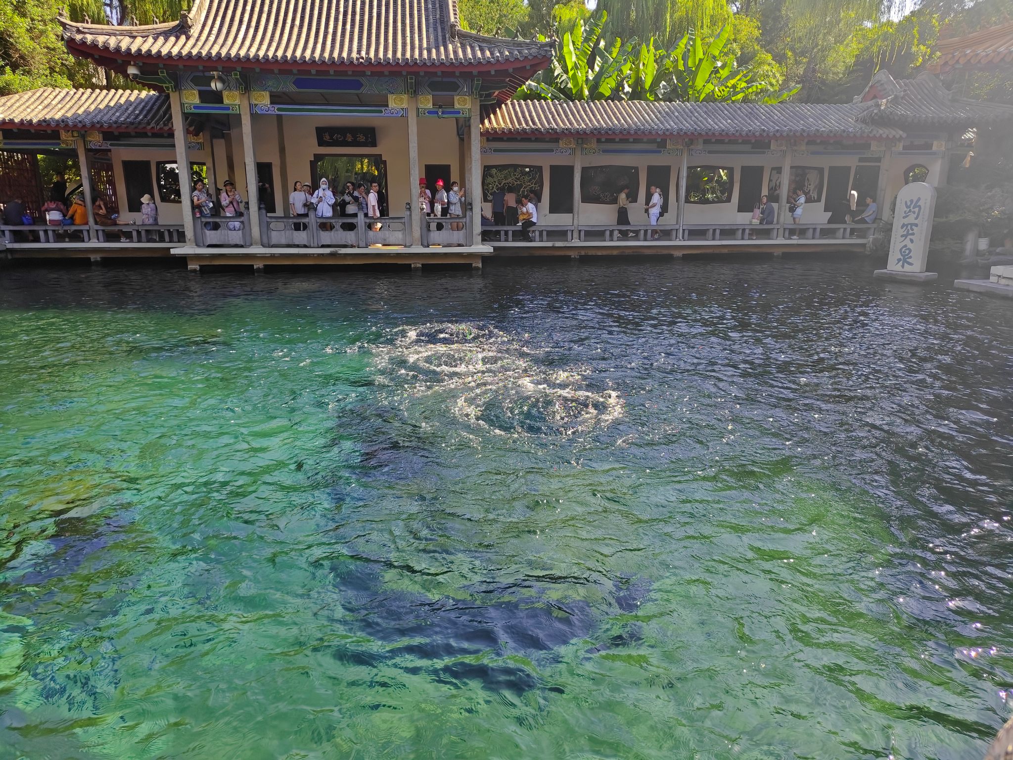 从趵突泉出来,沿着护城河走到大明湖。红柱彩檐的牌坊下,垂柳已悄悄冒出新芽,预示着春的脚步。湖面上,游船点点,岸边的祈福牌随风轻晃,上面写满了人们对新年的期盼。