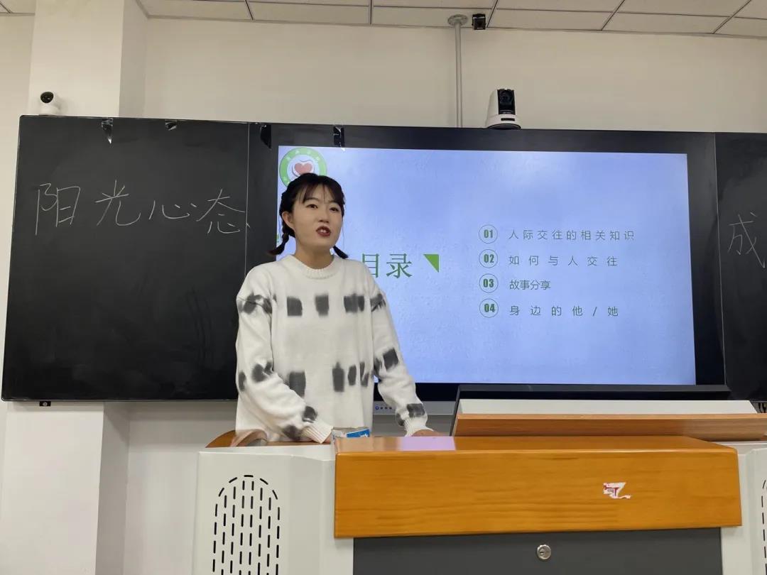戴可欣同学主要讲述了大学生在人际交往中的相关知识。她通过视频资料和案例重点讲述了在大学生活中如何与人更好地交往,包括大胆向同学介绍自己、调整一个良好的交往心态、积极融入群体等方面,并向同学们强调如果自己认为在人际交往方面心理存在一些障碍,要及时解决、积极咨询、积极交流。
