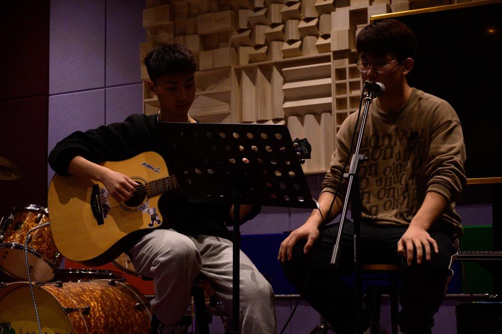 本次交流会分为歌曲演唱、吉他弹唱、吉他合唱以及击鼓传花等娱乐活动。表演协会会长陈泓羽带来《love yourself》、《乌云中》、《天上飞》三首歌曲,他深情演绎,为在场成员带来了一场视听盛宴,将全场气氛推向高潮。伟德国际victor·1946源自2021级大数据与会计专业王明阳压轴出场,为大家带来一首《半生雪》,歌词真挚朴实,细腻感人。在他的低吟浅唱中,同学们沉浸其中,一曲毕,赢得了阵阵掌声。