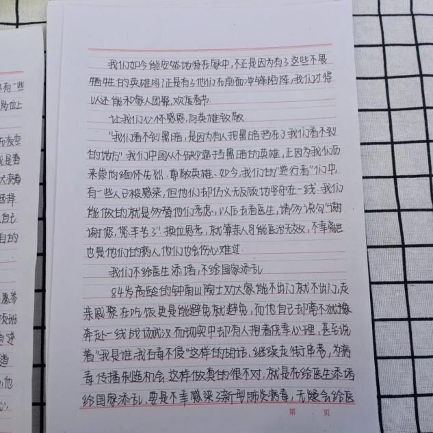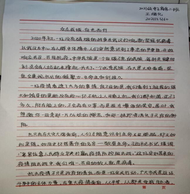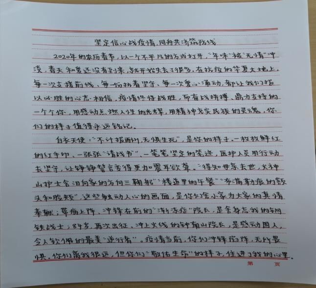 在2020级经济信息管理专业孙莹莹的笔下,这是“我们看不到黑暗,是因为有人把黑暗挡在了我们看不到的地方”“与浩荡的人流相背,与万家灯火的气氛相违”的舍小我为大家的无私奉献精神。在2021级大数据与会计专业二班盛裕笔下,又是“待黎明破晓,山河无恙,人间皆安时,你我携手,相视一笑,看那人生鼎沸,樱花怒放,笑声遍布山川”的美好期望。在2021级大数据与会计专业二班吴子昂笔下则是白衣天使“不计报酬,无惧生死”、党员干部“挺身而出,冲锋在前”、人民群众“勠力同心,共克时艰”的责任意识。