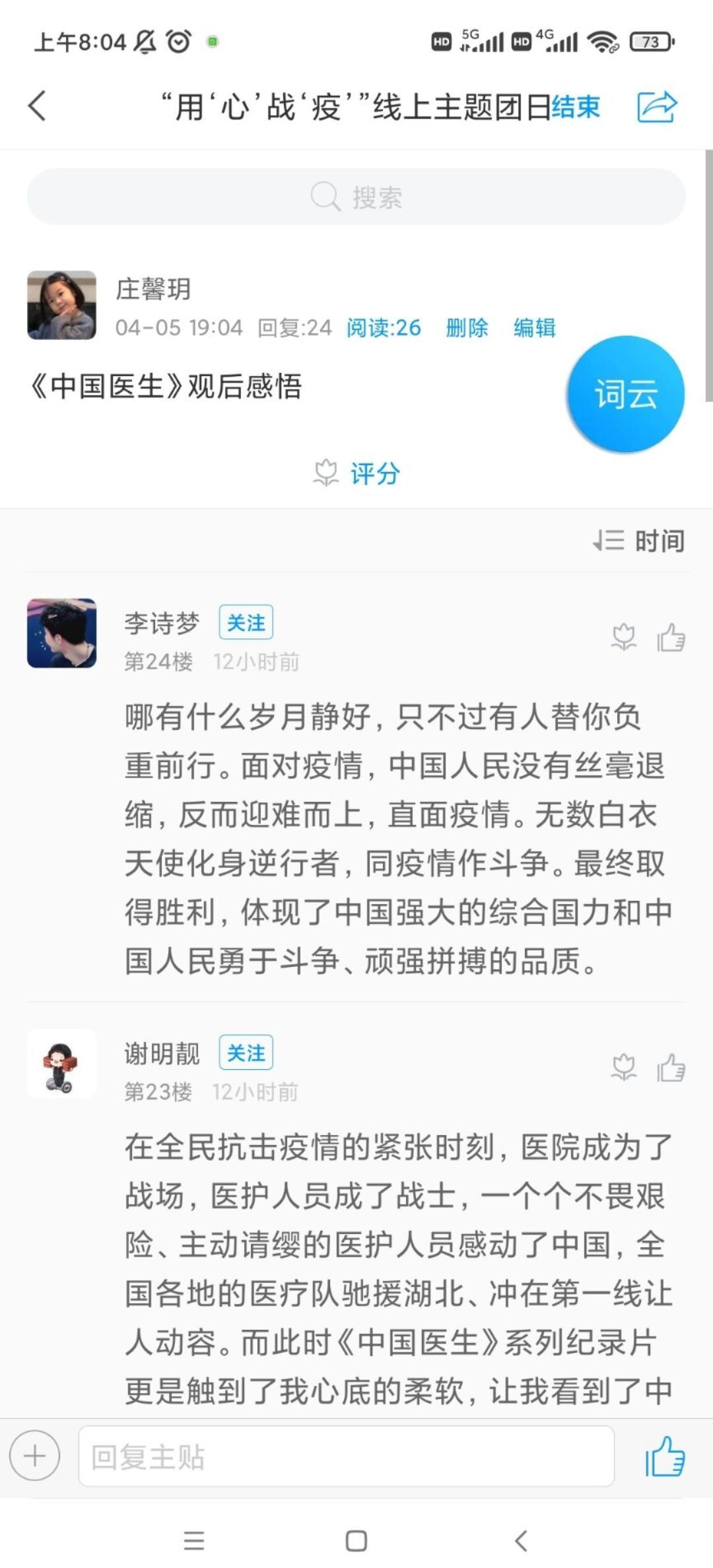 “哪有什么岁月静好,只不过有人替你负重前行。”通过观看《中国医生》这部影片,使同学们进一步了解防疫工作人员在一线工作的辛苦,并表示要积极配合疫情防控工作,更加珍惜当下。同学们纷纷表示钟南山、张定宇等心系苍生、逆行向险、不畏艰难的精神将会化成无形的“指针”激励着我们不断奋进、坚持不懈、勇攀高峰。