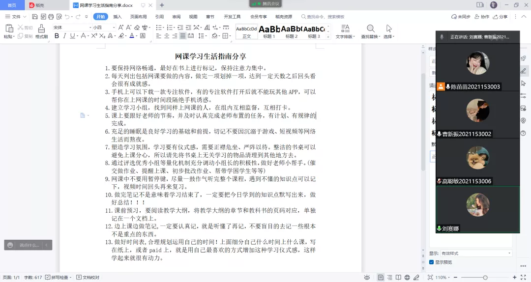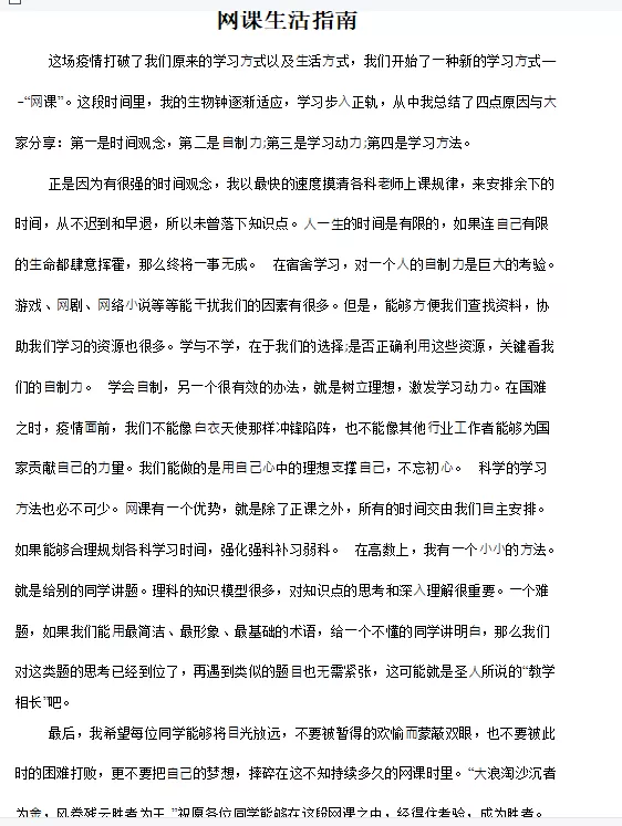 在本次活动中,同学们积极分享一些好的网课学习做法,经验,建议等,由各班团支书加以总结,形成网课学习生活指南,在团日活动中进行分享。如塑造学习氛围、建立“仪式感”,有重点的去做笔记、制定合理高效的学习计划等。合理的学习计划对于每位学生来说都很重要,适合自己的才是最好的。
