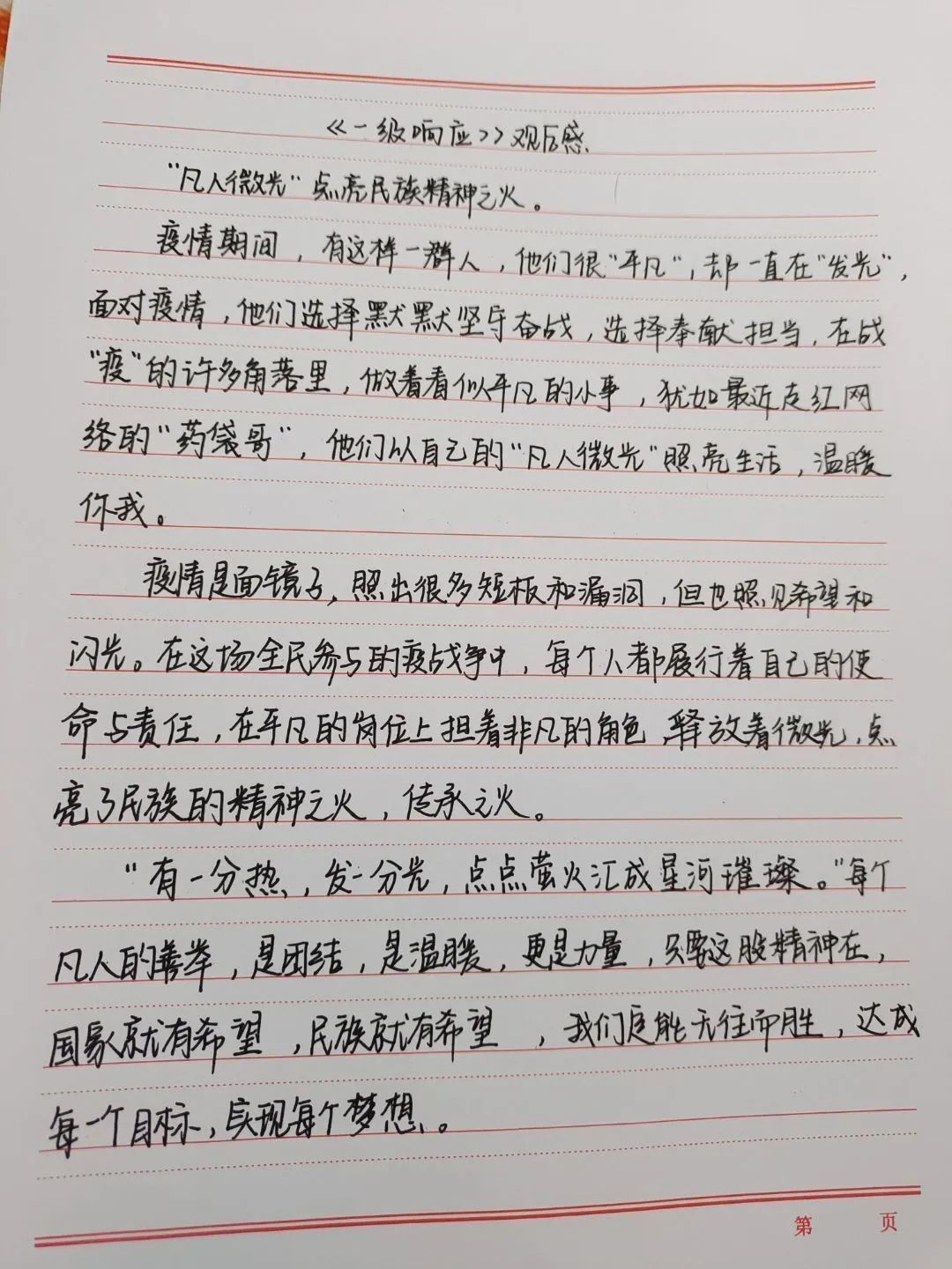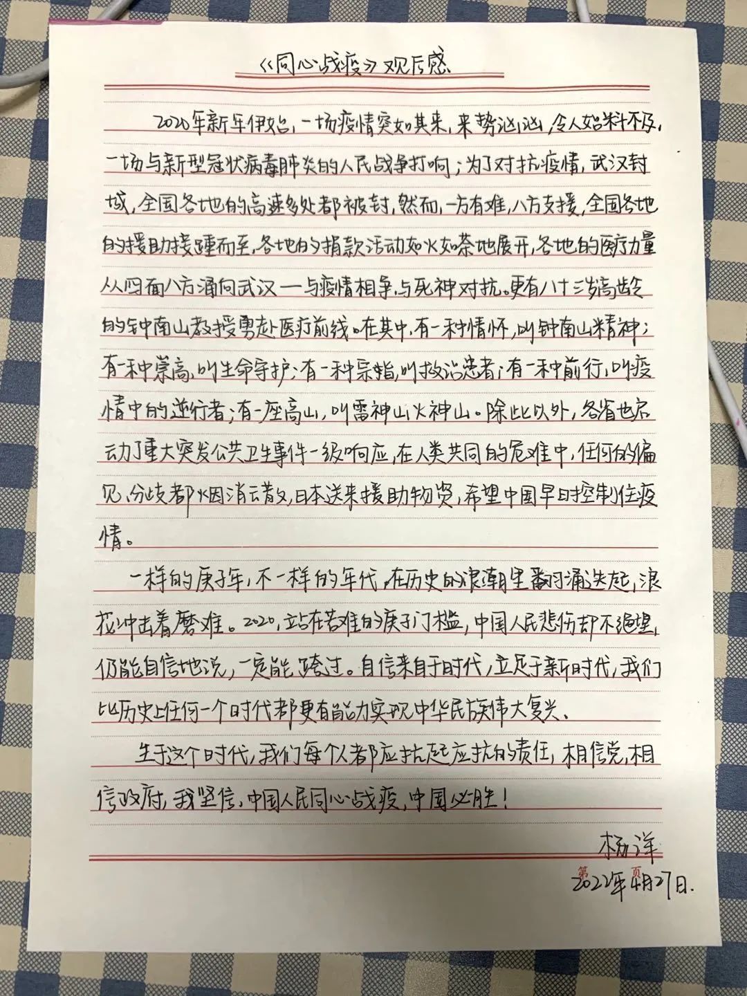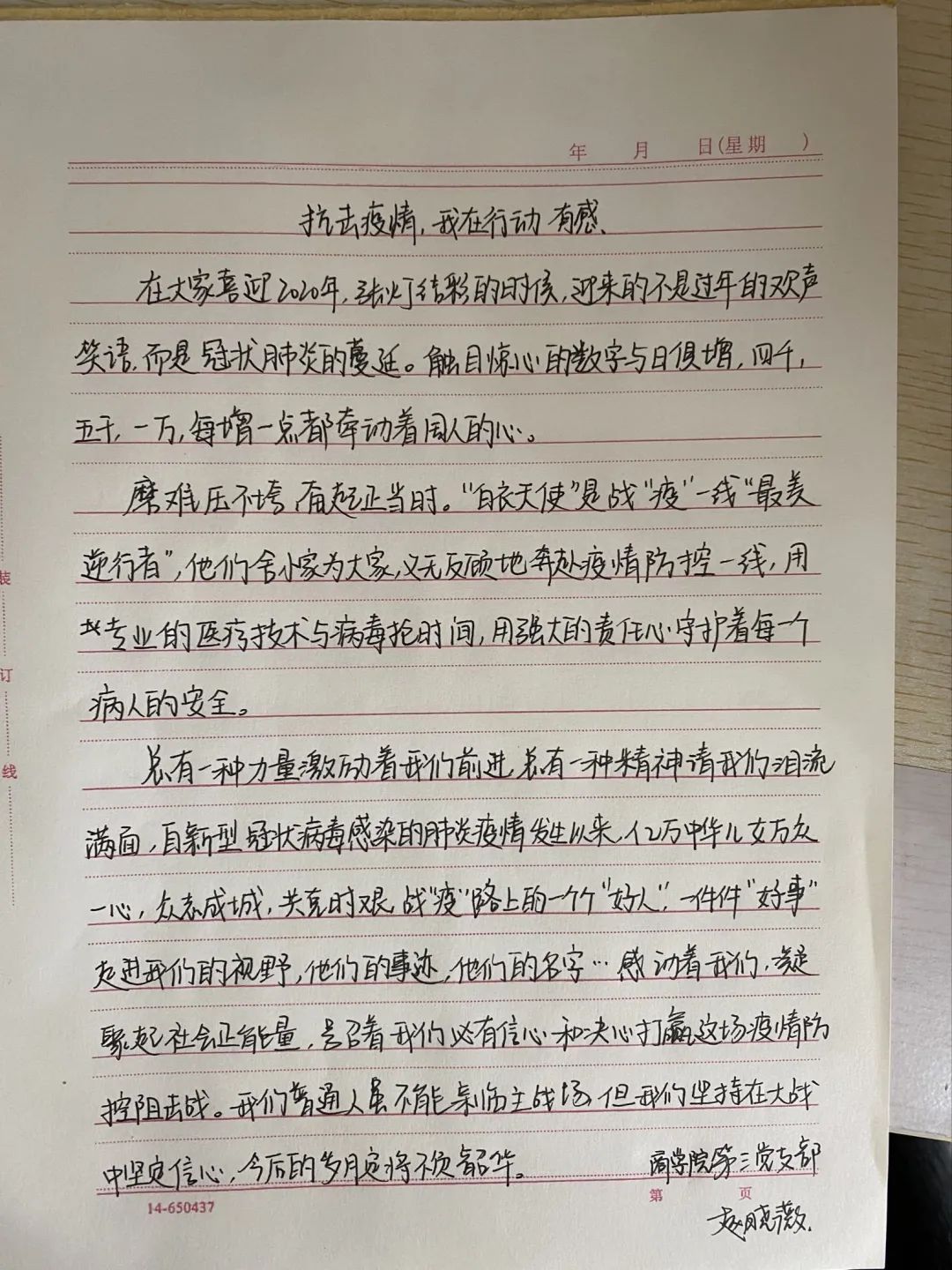 学生党员们积极观看抗“疫”视频并写下感悟,其中,2021级财务管理(专升本)专业赵晓薇写道:“金杯银杯,不如群众的口碑;千响万响,不如实干的锤响。”2019级财务管理(春)专业辛昊在感悟中提到:“有一分热,发一分光,点点萤火汇成星河璀璨。”学生党员通过感悟纷纷表达了战胜疫情的信心和决心。