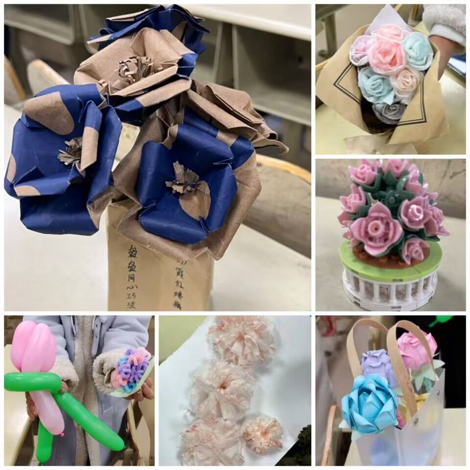 参赛同学以手工制作花束的形式,赋予花束以灵魂,借花束表达对亲友的爱与老师的尊敬等情感。活动过程中,同学们充分发挥想象力,认真、细心、耐心制作自己的专属花束,作品精美富有创意。