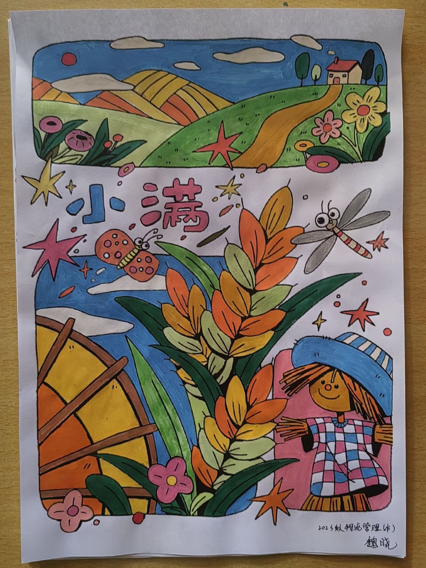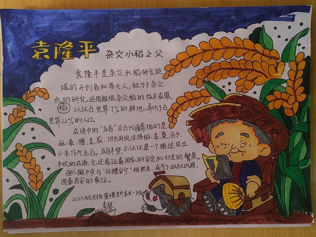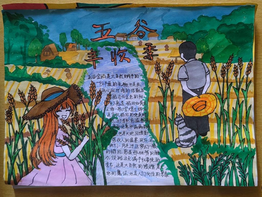 本次活动过程中,同学们通过手抄报的方式来表现自己心中“五谷丰登”的景象,展示出五谷的历史、文化以及其在现代社会中的应用。在他们的笔下“五谷丰登”是金色的麦浪,是满载的箩筐,是稻下乘凉的袁隆平爷爷。他们的作品并不是寥寥数笔带过的填色,而是深入挖掘后的精心描绘,展现出同学们对五谷文化的尊重与喜爱。