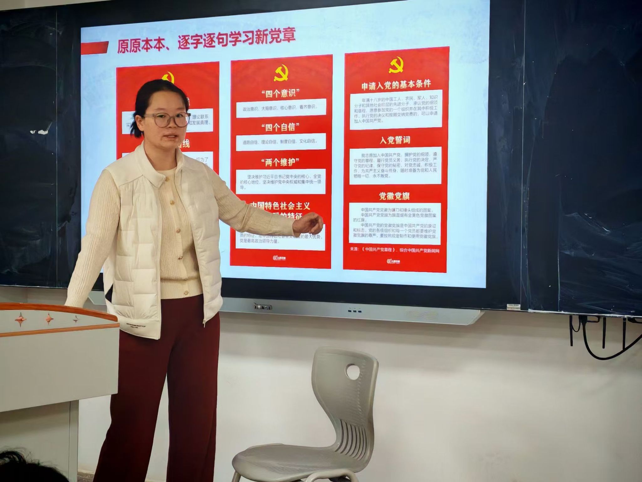 继而,孙雪同志针对《中国共产党章程》第一章进行详细讲解,阐释了民主集中制的根本原则及党的各级领导机关的生成方式,强调在党内决策、选举等重大事项中坚持民主集中制的必要性,激发了在场参训学员对理论学习的使命感和责任感。