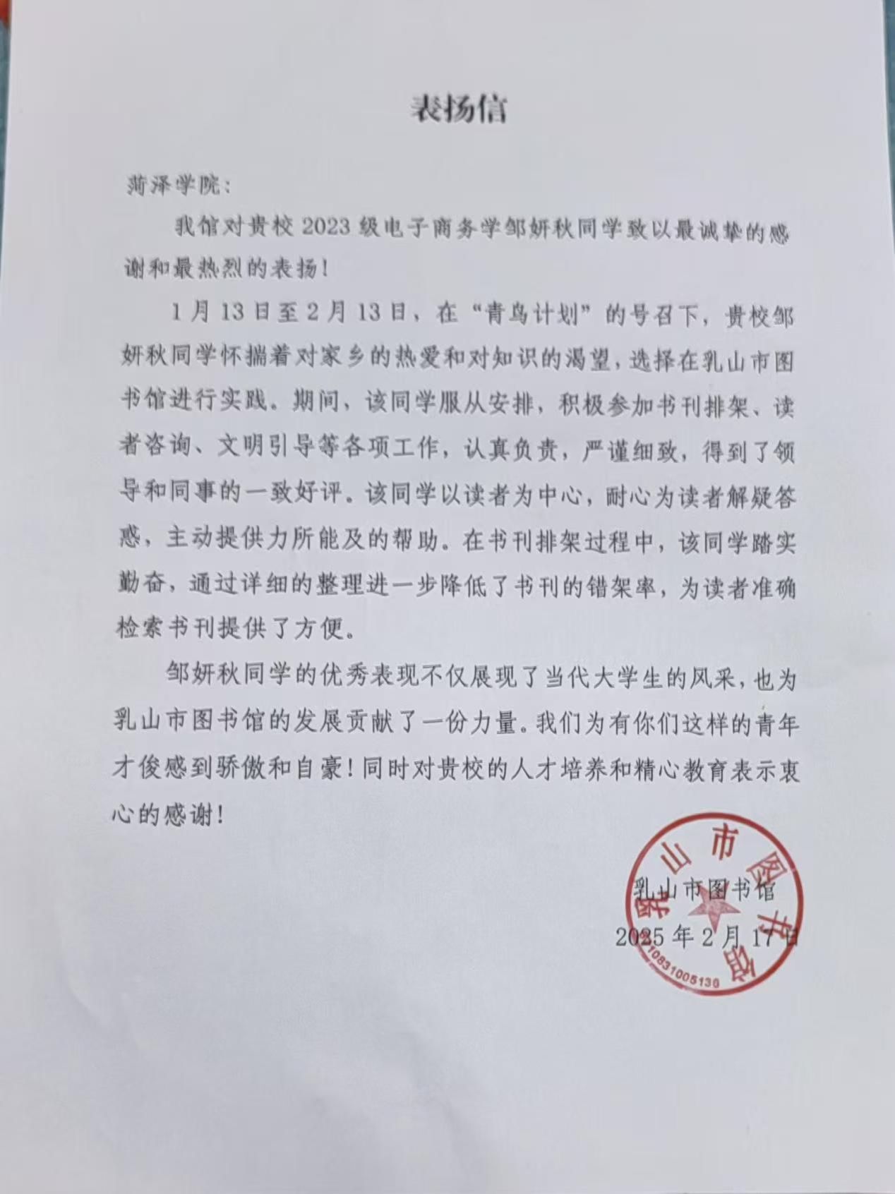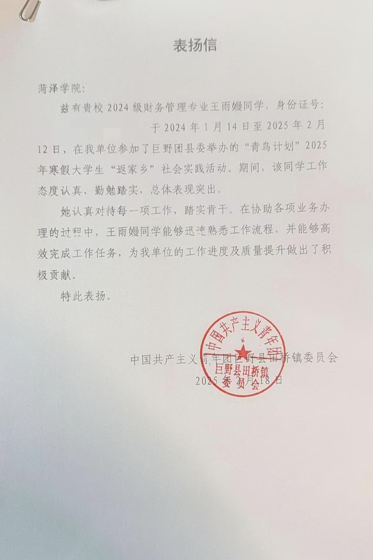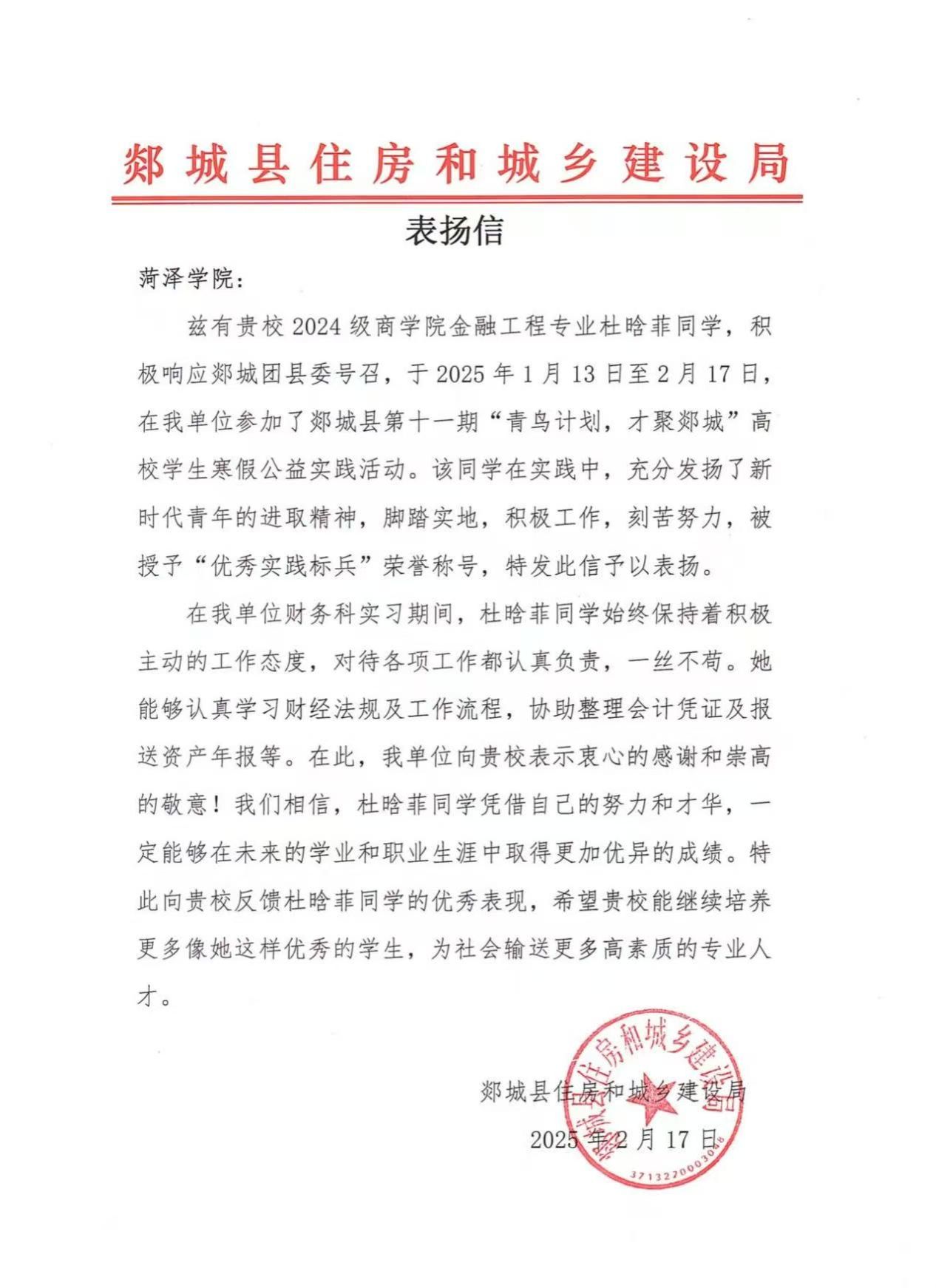 寒假期间,我院学子积极响应号召,怀揣满腔热忱,返乡投身实践、深入基层,凭借专业知识,为乡村发展出谋划策。他们在各自岗位默默耕耘,以实际行动为家乡发展贡献青春力量 。近日,我院收到多封感谢信、表扬信,信中对我院同学在2025年“青鸟计划”大学生返家乡社会实践活动中提出表扬,给予肯定,同时也对学院精心培育出品学兼优、德才兼备的人才表示诚挚谢意。