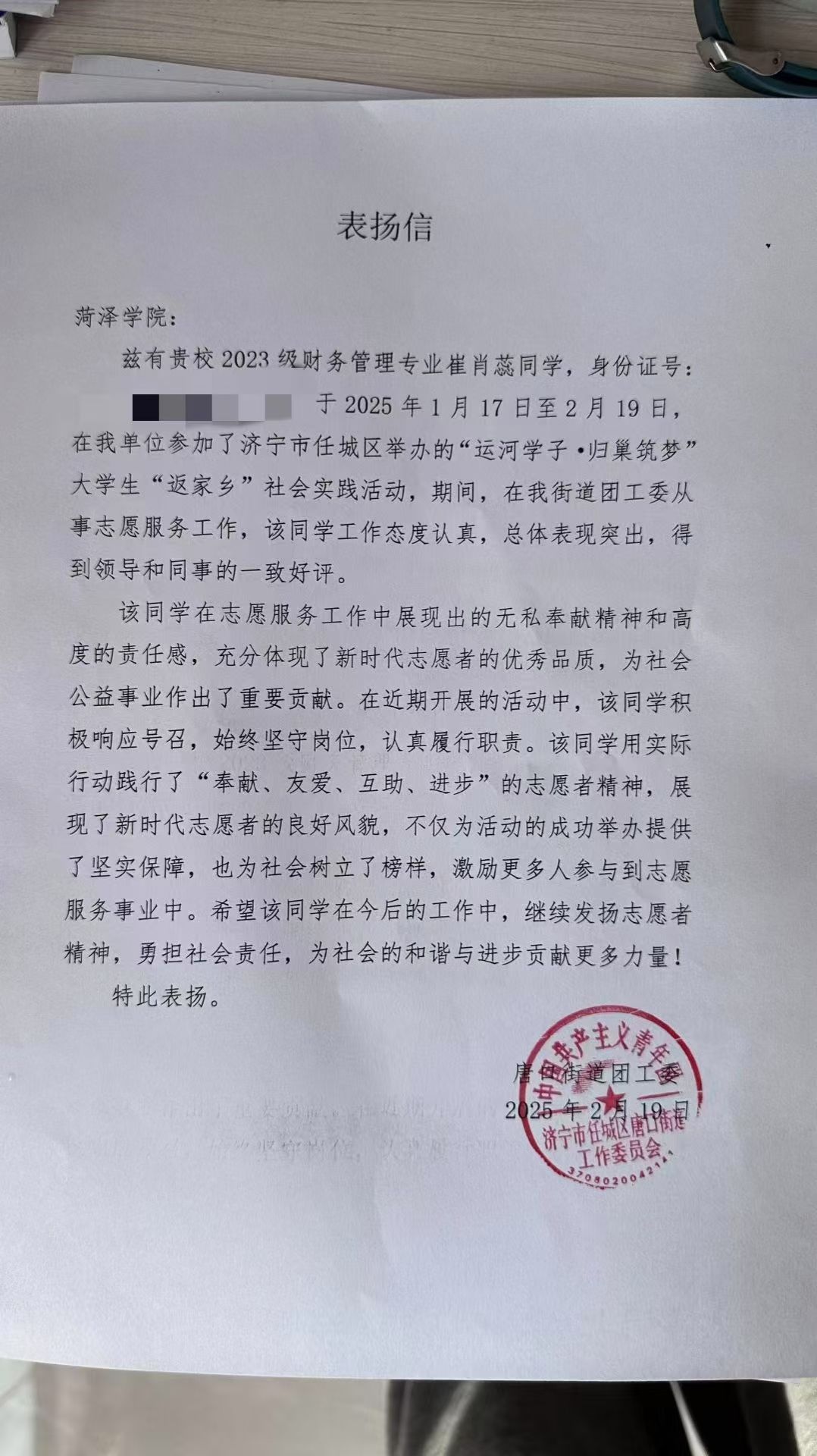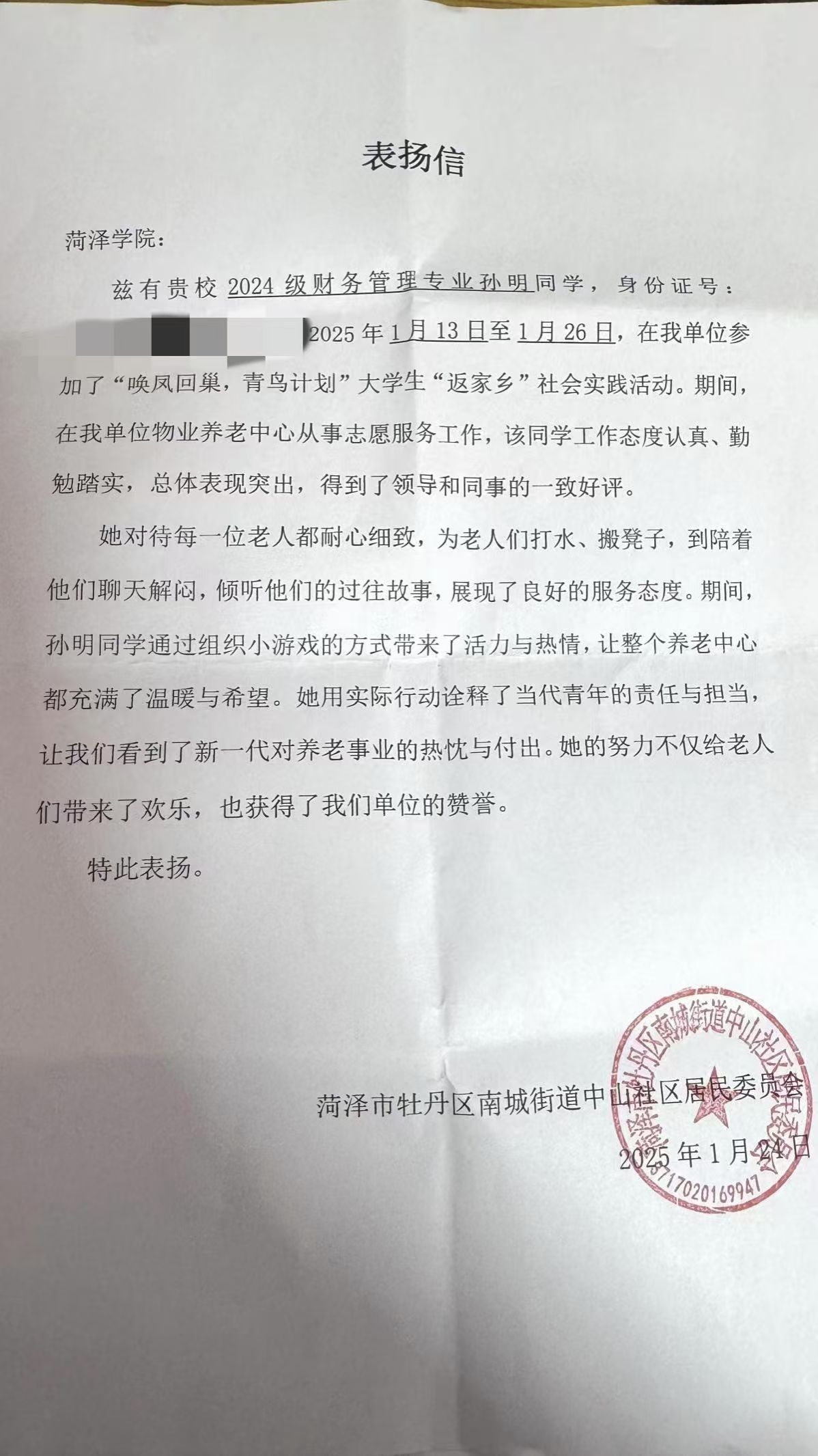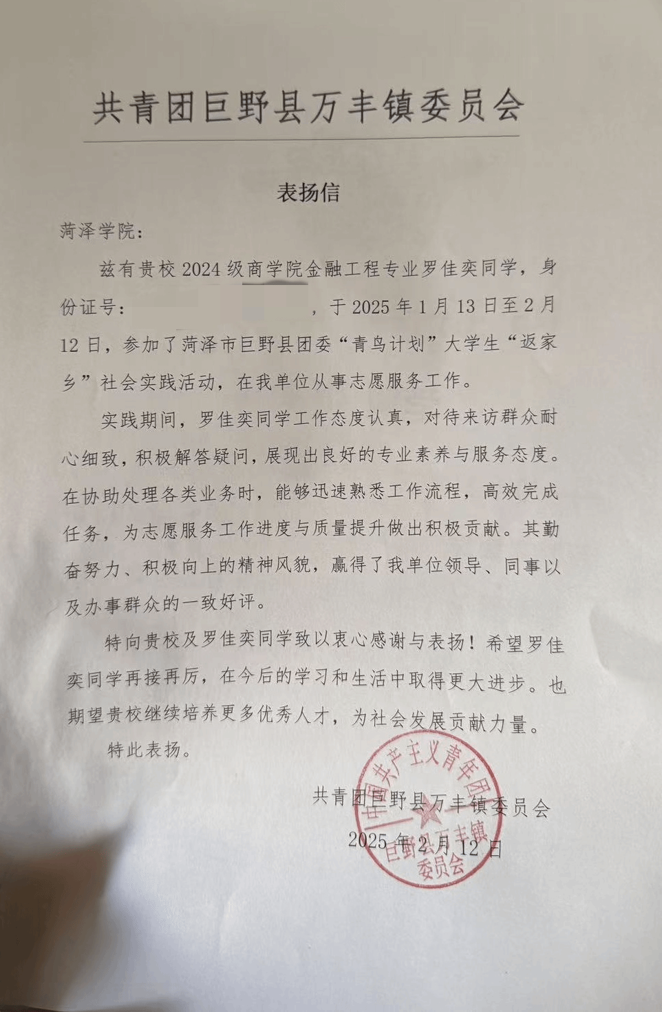 寒假期间,我院学子积极响应号召,怀揣满腔热忱,返乡投身实践、深入基层,凭借专业知识,为乡村发展出谋划策。他们在各自岗位默默耕耘,以实际行动为家乡发展贡献青春力量 。近日,我院收到多封感谢信、表扬信,信中对我院同学在2025年“青鸟计划”大学生返家乡社会实践活动中提出表扬,给予肯定,同时也对学院精心培育出品学兼优、德才兼备的人才表示诚挚谢意。