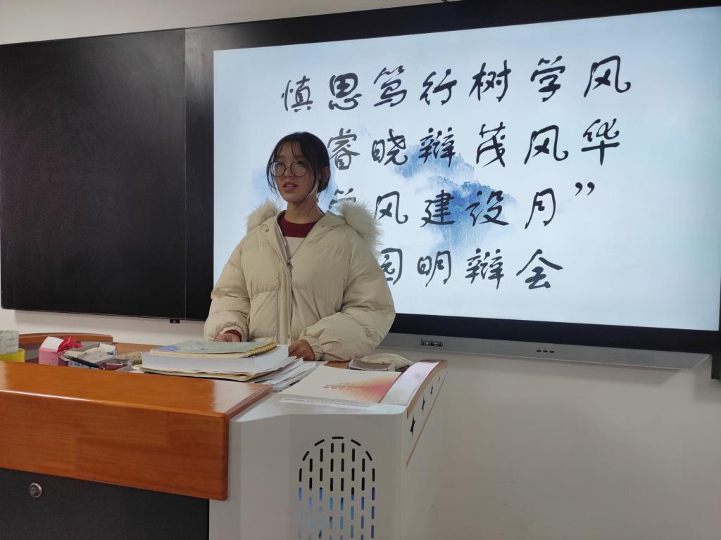 活动伊始,两队参赛选手围绕“慎思笃行树学风,明睿晓辩茂风华”的主题分别上台阐述自己的观点。21级电商马良汉以《责任之灯燃永夜,学习之风伴我行》为题阐述学风建设的关键。随着比赛的进行,场上的气氛变得紧张起来,各位参赛选手依旧思路清晰、滔滔不绝、妙语连珠,丝毫不受影响,赢得在场观众的阵阵掌声。在进行完阐述后,双方进行讨论、取长补短,最终双方一致认为学风建设的关键在于学生的切实践行。