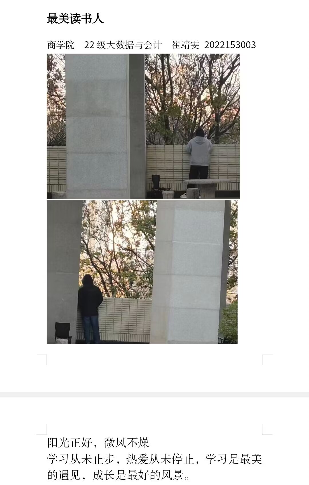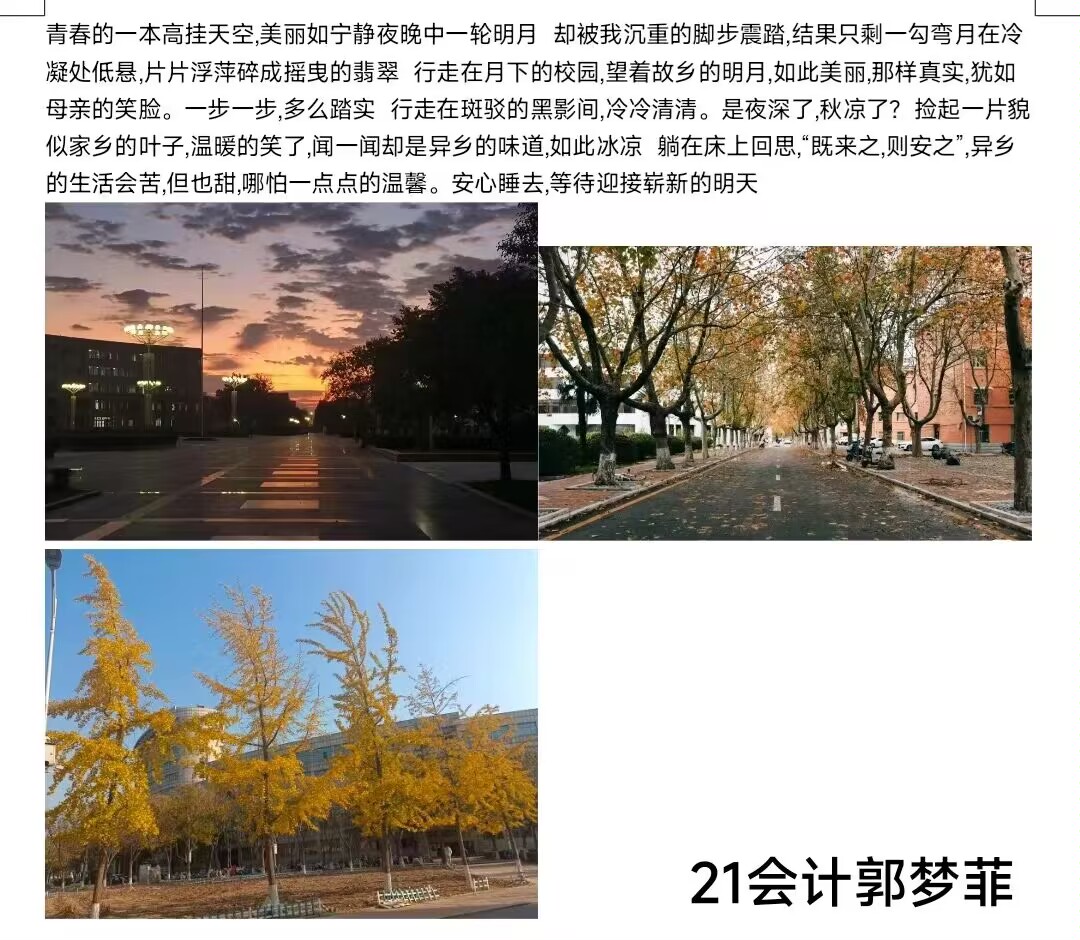 活动的独特意义吸引我院摄影爱好的学生积极参加,涌现出了大量优秀的作品。参赛同学用善于观察的眼睛发现美好瞬间,记录美好时刻,感受学校独特的魅力,描绘出校园内学生勤奋求知的身影,展现了学校积极向上的精神风貌。