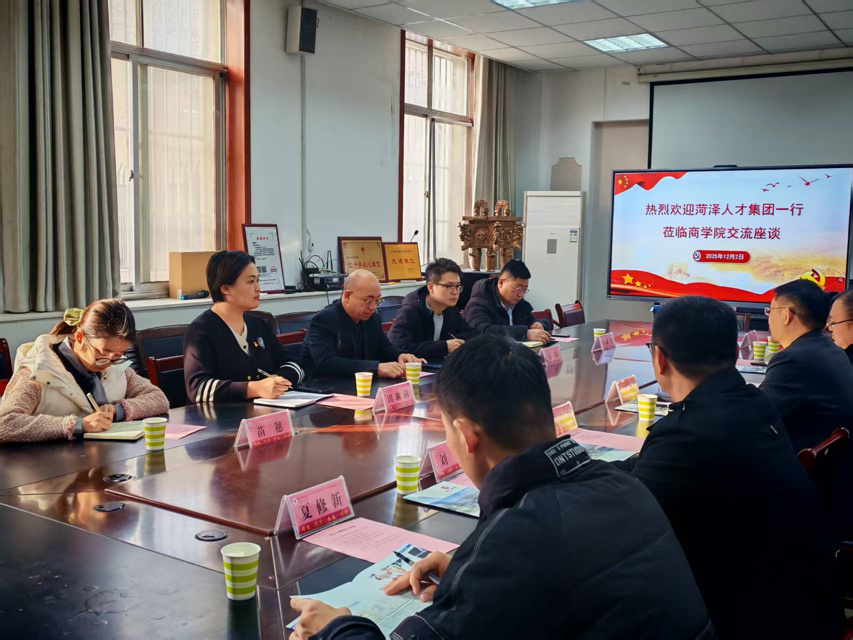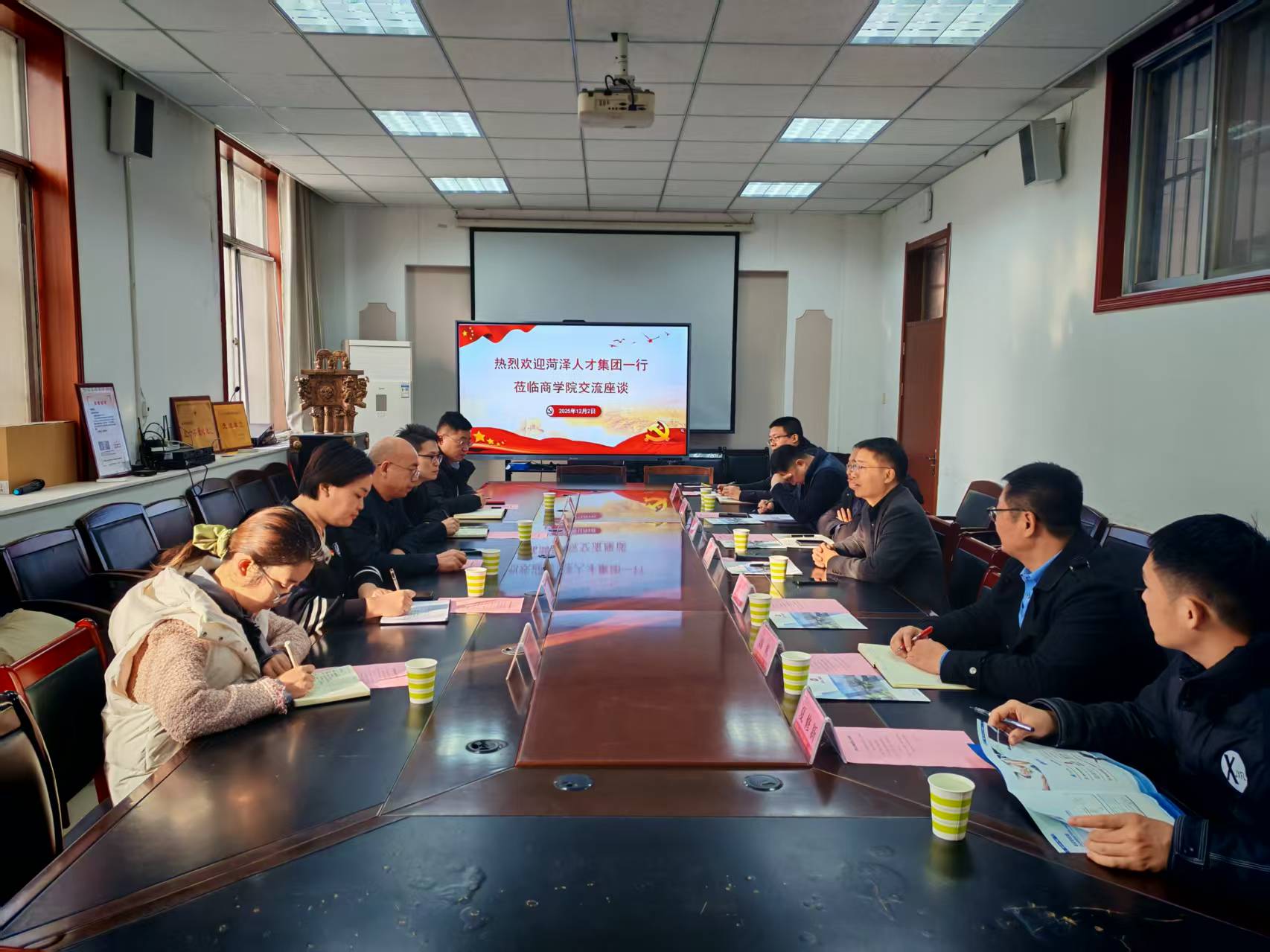 座谈会上,尹鹏对菏泽人才集团一行的到来表示热烈欢迎,详细介绍了学院的专业布局、师资力量、人才培养特色及近年来在产学研合作、学生高质量就业等方面的成果。他表示,学院始终立足区域产业发展需求,聚焦复合型、应用型人才培育,而菏泽人才集团作为市委、市政府打造的专业化人才服务平台,在全链条人力资源服务领域具备独特优势,期待双方以此次座谈为契机,构建长效合作机制。