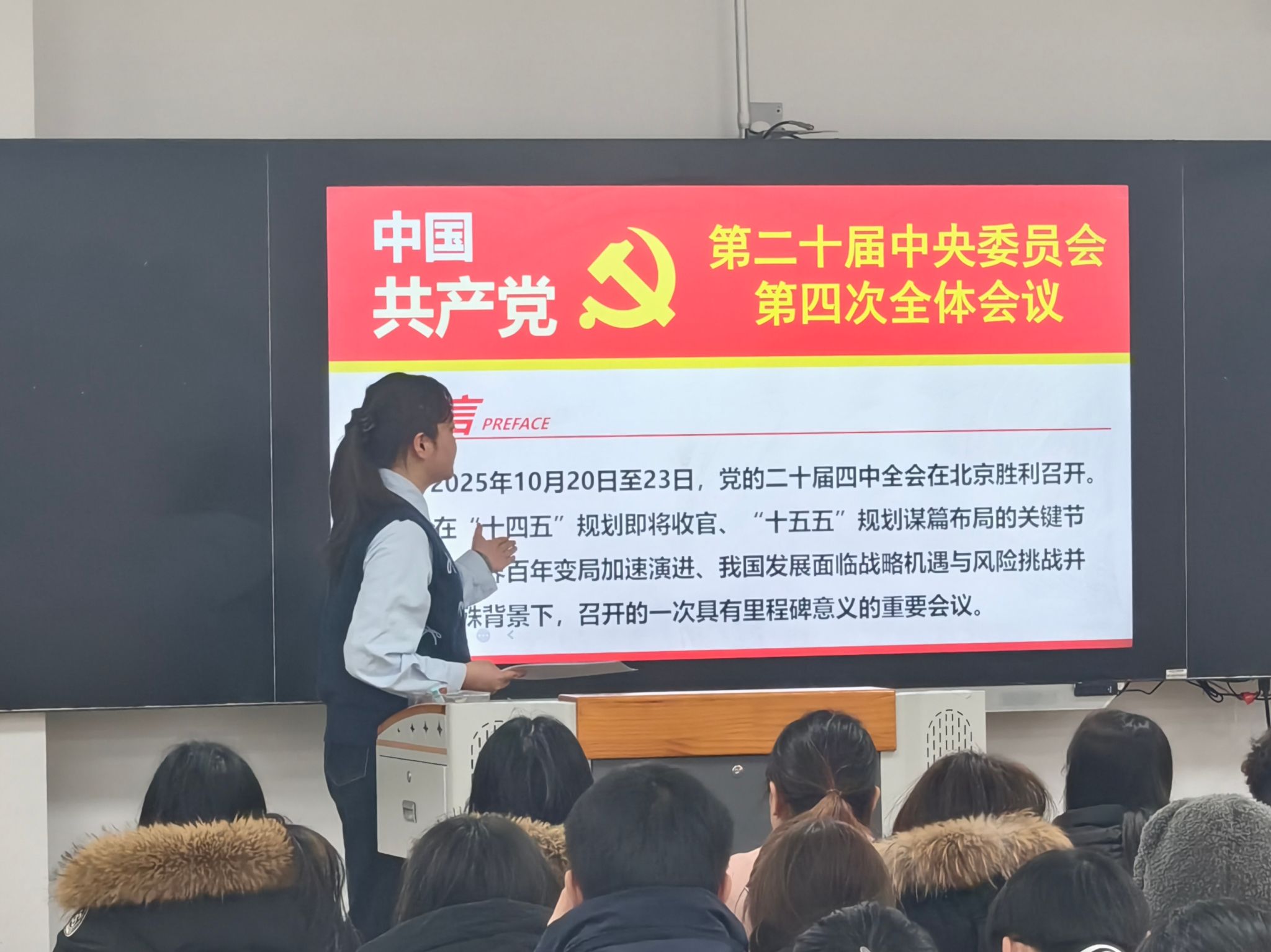 12月14日,伟德国际victor·1946源自于8号教学楼212教室举办党的二十届四中全会精神宣讲活动,由学校青年师生宣讲团成员郑彤炜担任主讲人。