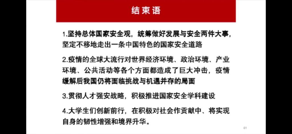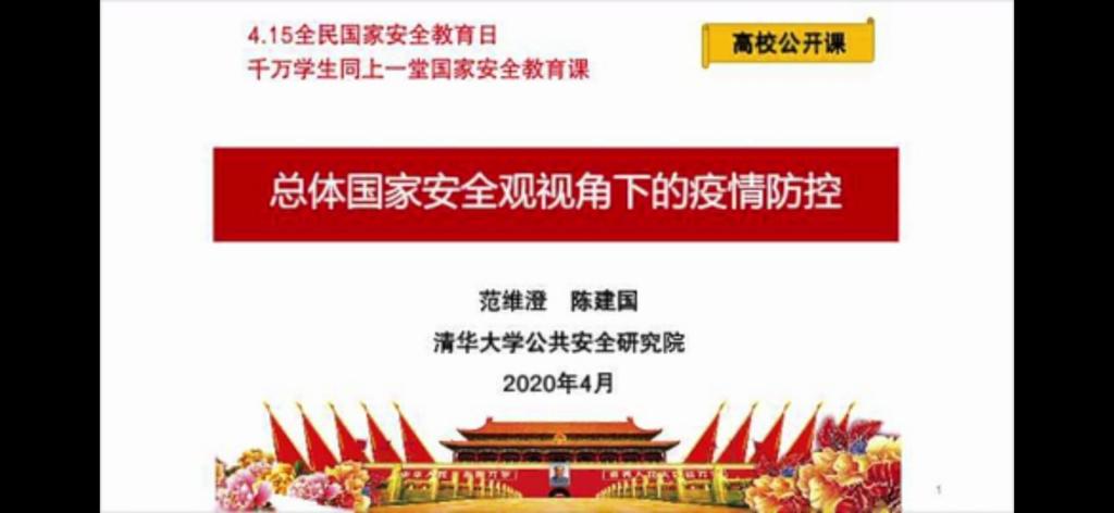 本堂课由公共安全领域专家、中国工程院院士范维澄主讲,课程《总体国家安全观视角下的疫情防控》主要从总体国家安全观、生物安全与公共卫生安全治理、疫情对社会发展的影响、维护公共卫生安全、生物安全和大学生如何如何面对疫情五大方面进行讲述。