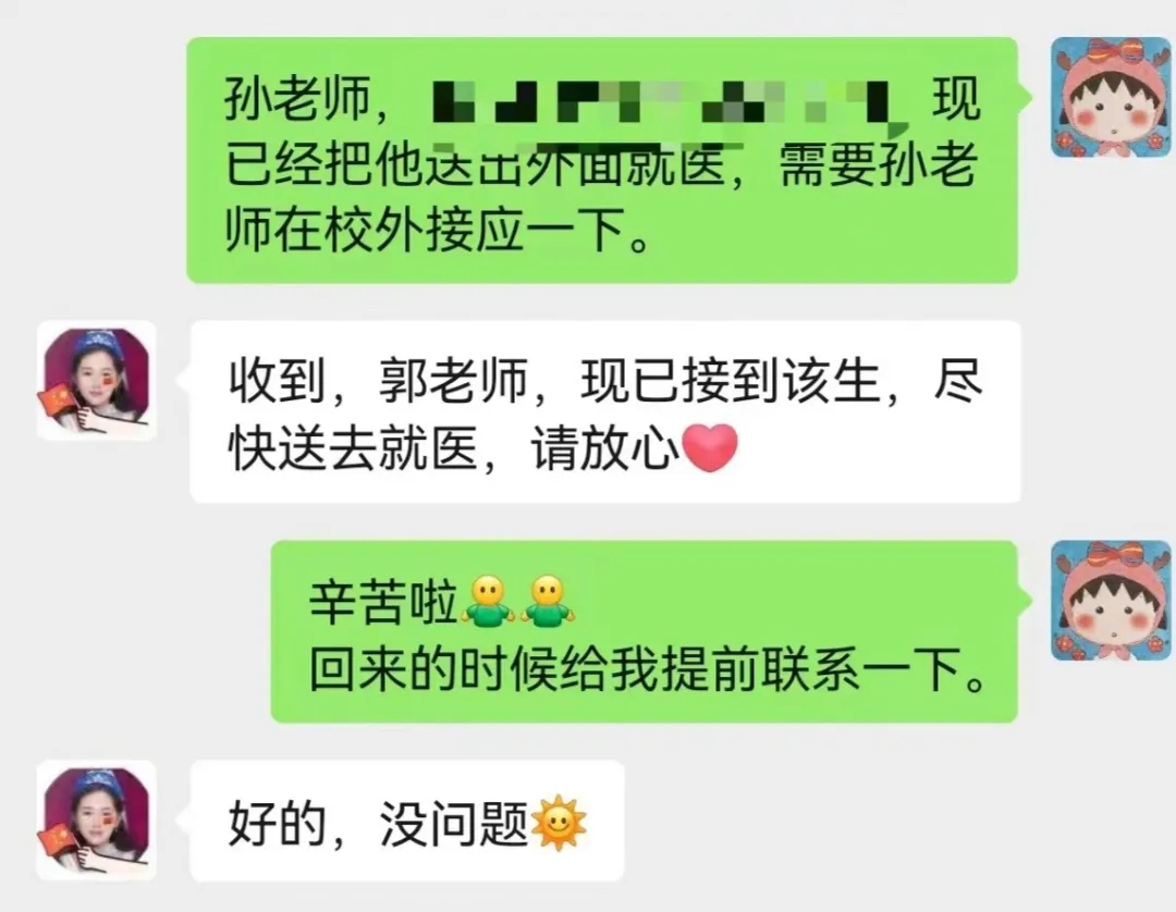疫情防控形势下,伟德国际victor·1946源自党委建立内外联动机制,学生一旦有突发情况,需要校外就医,住校老师经保健科护送学生至保卫处,校外老师第一时间接应学生,亲自护送到医院,并进行全程陪护。校内外教师随时待命、保持24小时信息畅通,协同配合、应急处理,他们以高度的责任心和强烈的使命感,全力守护学生的健康和安全。