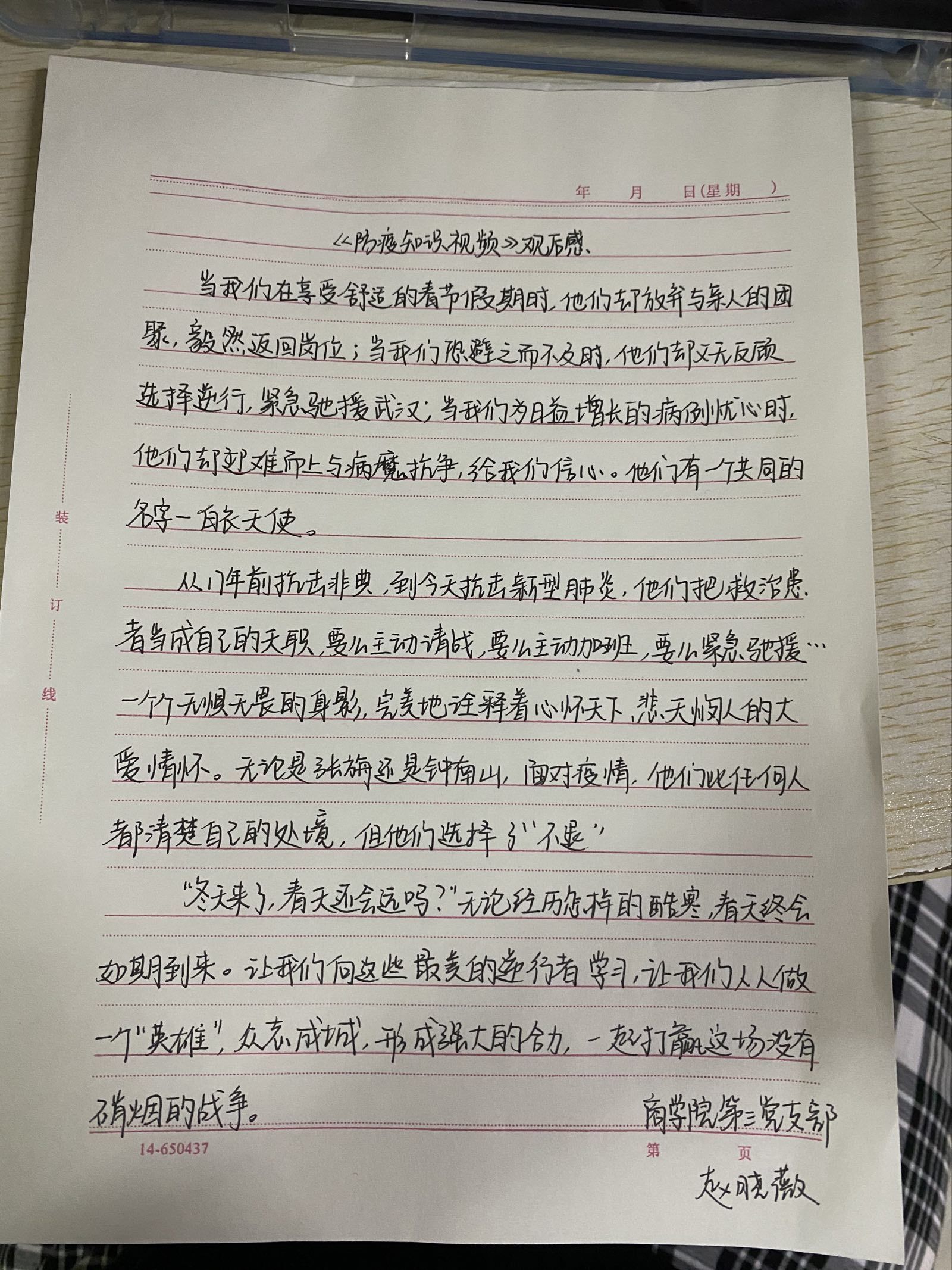 学生党员积极响应号召,认真观看,体会深刻。疫情当前,党员在先,2021级物流管理(专升本)专业王文昊在感悟中写道:“把投身防控疫情一线作为践行初心使命,体现责任担当的试金石和磨石刀。”2019级财务管理(夏)专业闫雨莹感慨:“疫情当前,小家和大国,无疑先有大国才有小家。”2018级经济学专业张珂写下:“以决战必胜的信心和勇气力夺战疫全胜。”字里行间诠释着党员的使命和担当。