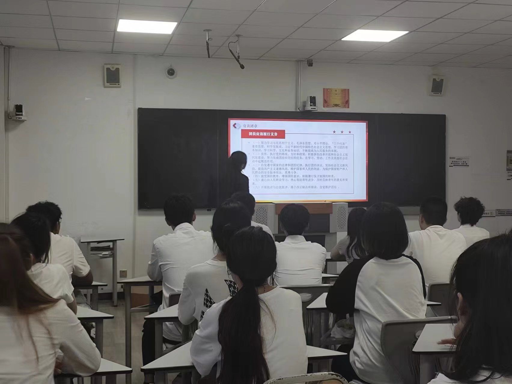 宣誓结束后,由入团介绍人代表方尧月领学《中国共产主义青年团章程》中有关团员权利与义务的相关内容,号召新老团员自觉遵守团的章程,履行团员义务,争做一名优秀的共青团员。