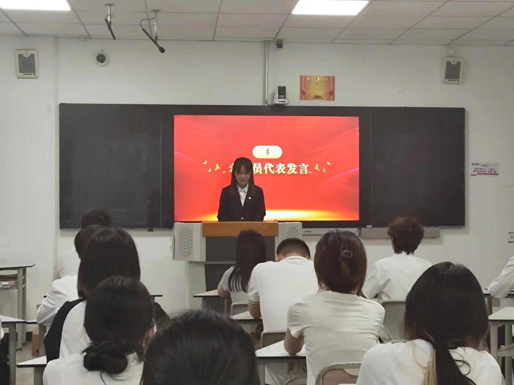 老团员代表郭盈贝同学在发言中表示新老共青团员应树立崇高理想,在学习生活中起带头作用,做一名合格的共青团员,尽心尽力地为班级、为学校、为社会做出贡献。张贺同学代表新团员发言,提出要时刻牢记自己是一名共青团员,按照团员的标准严格要求自己,真正从思想上加入到团的组织中去,以实现自己的入团誓词。