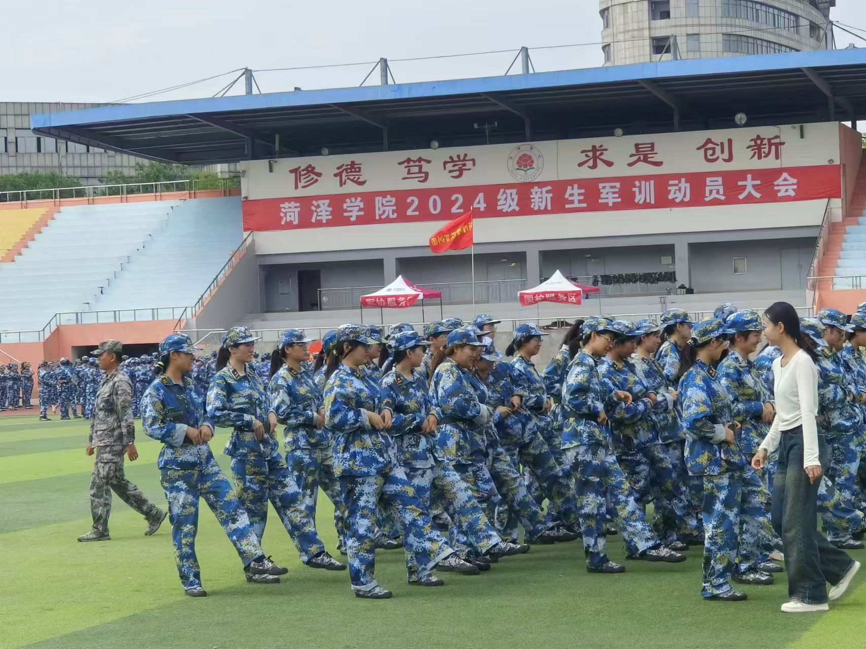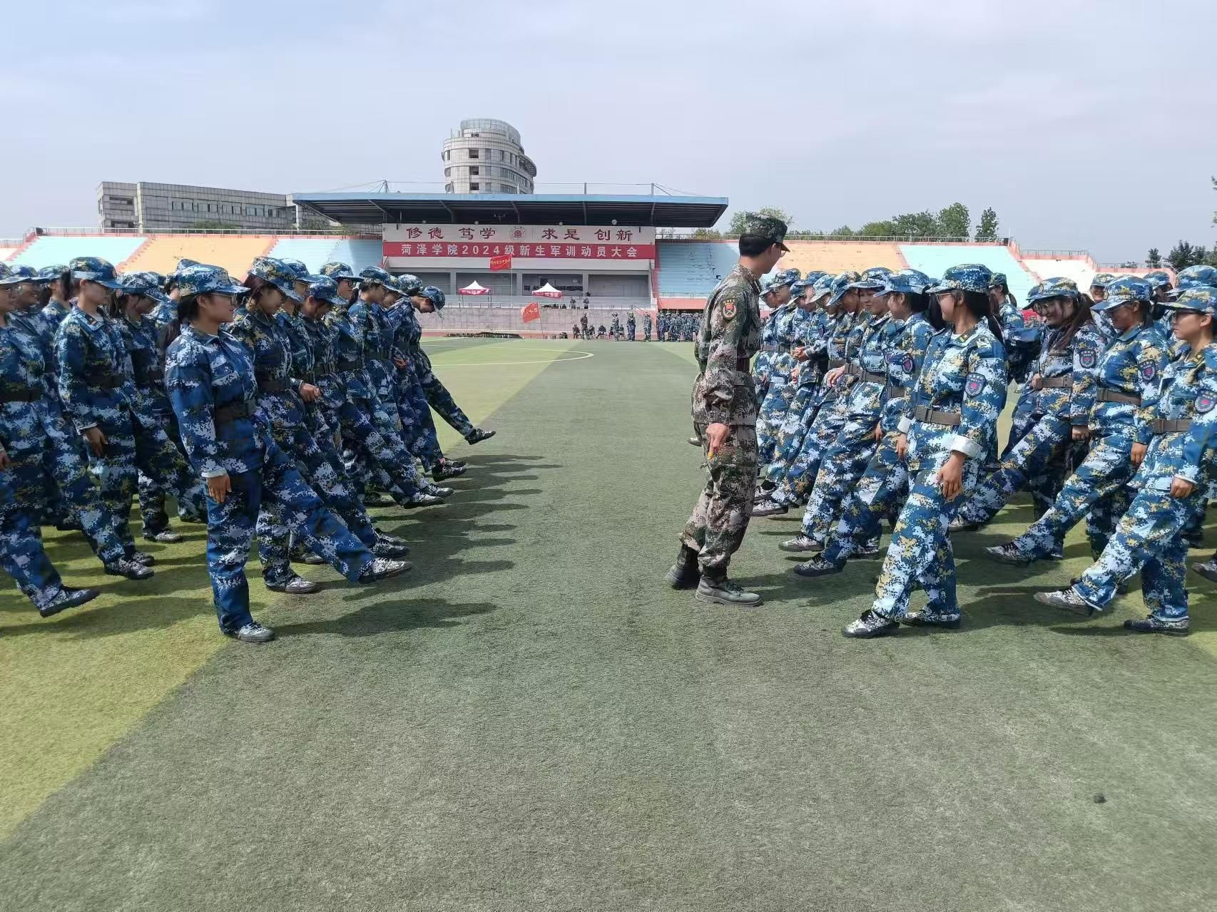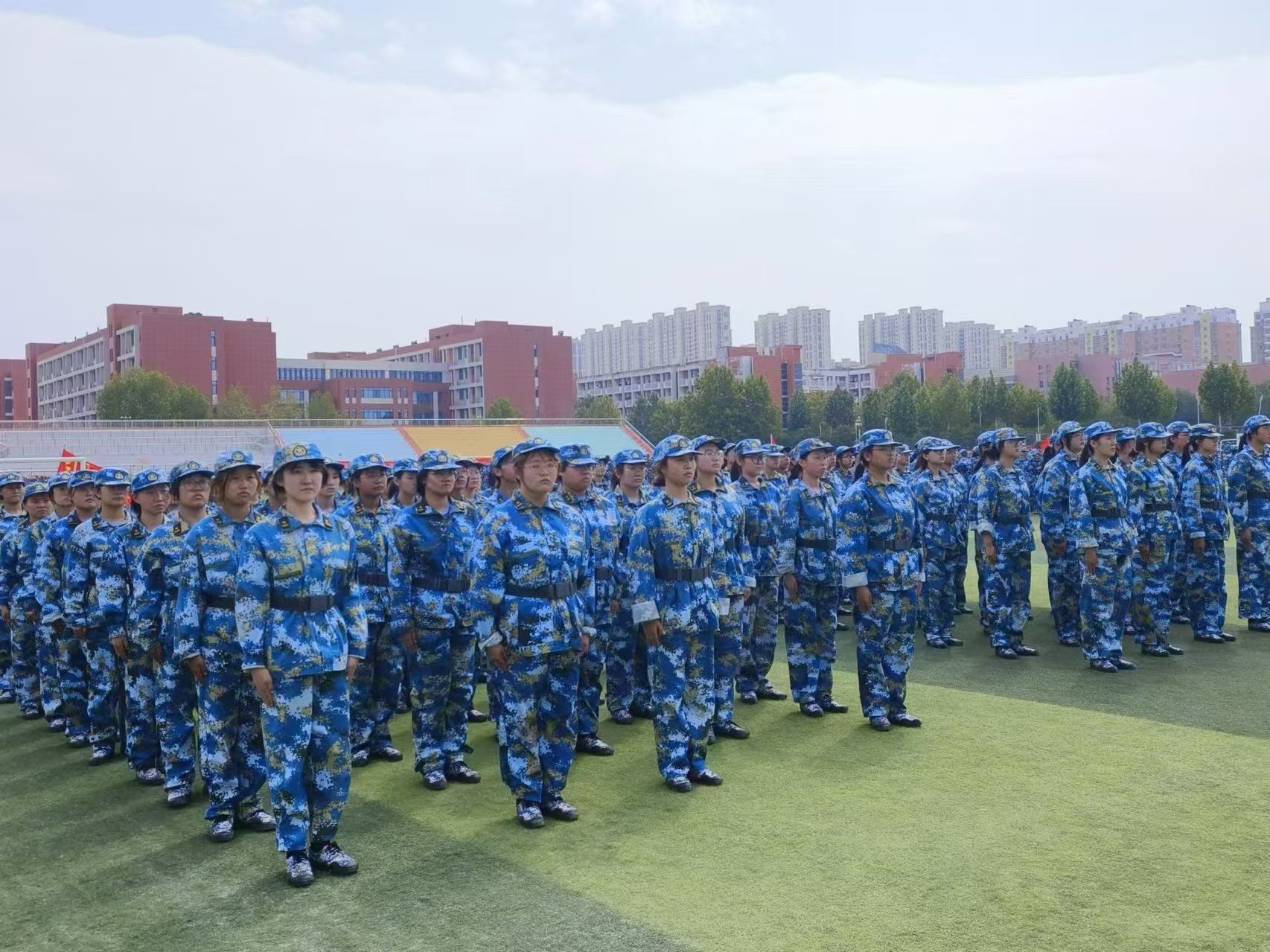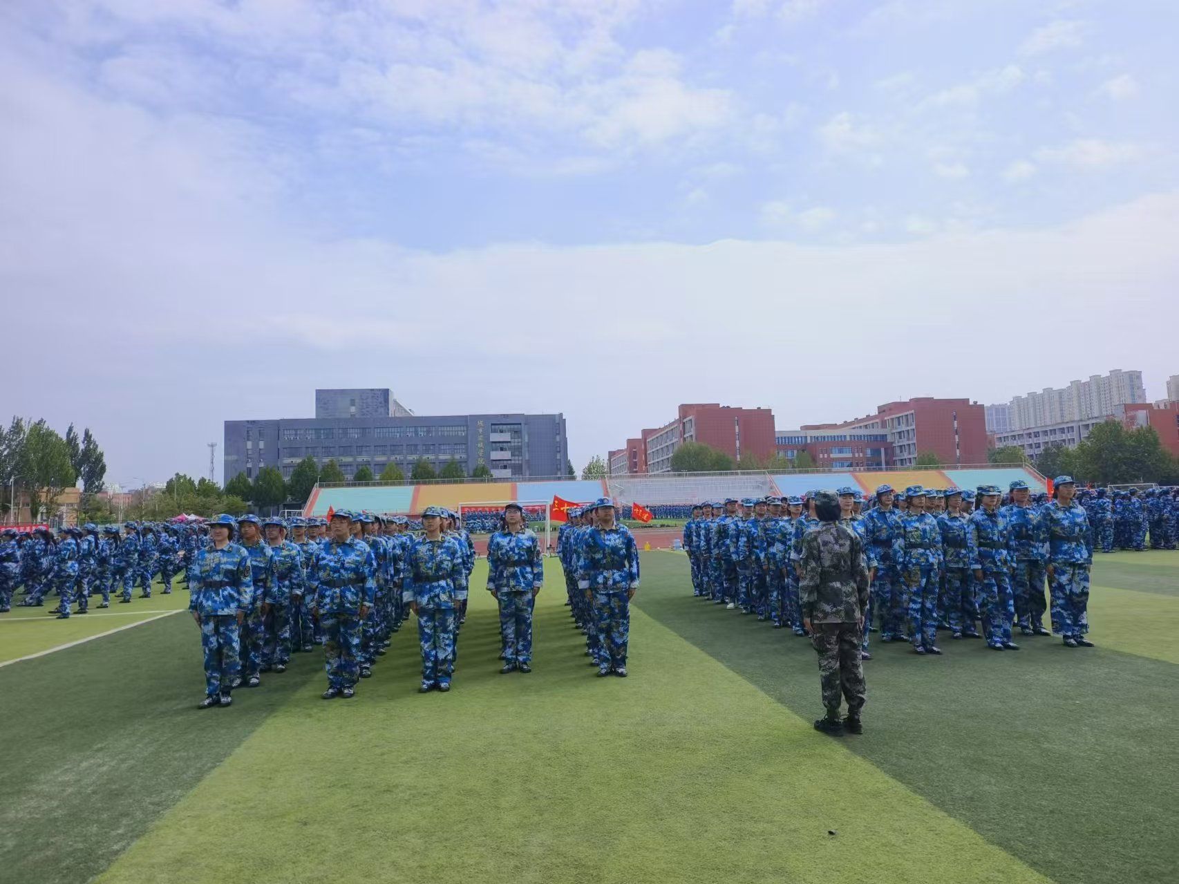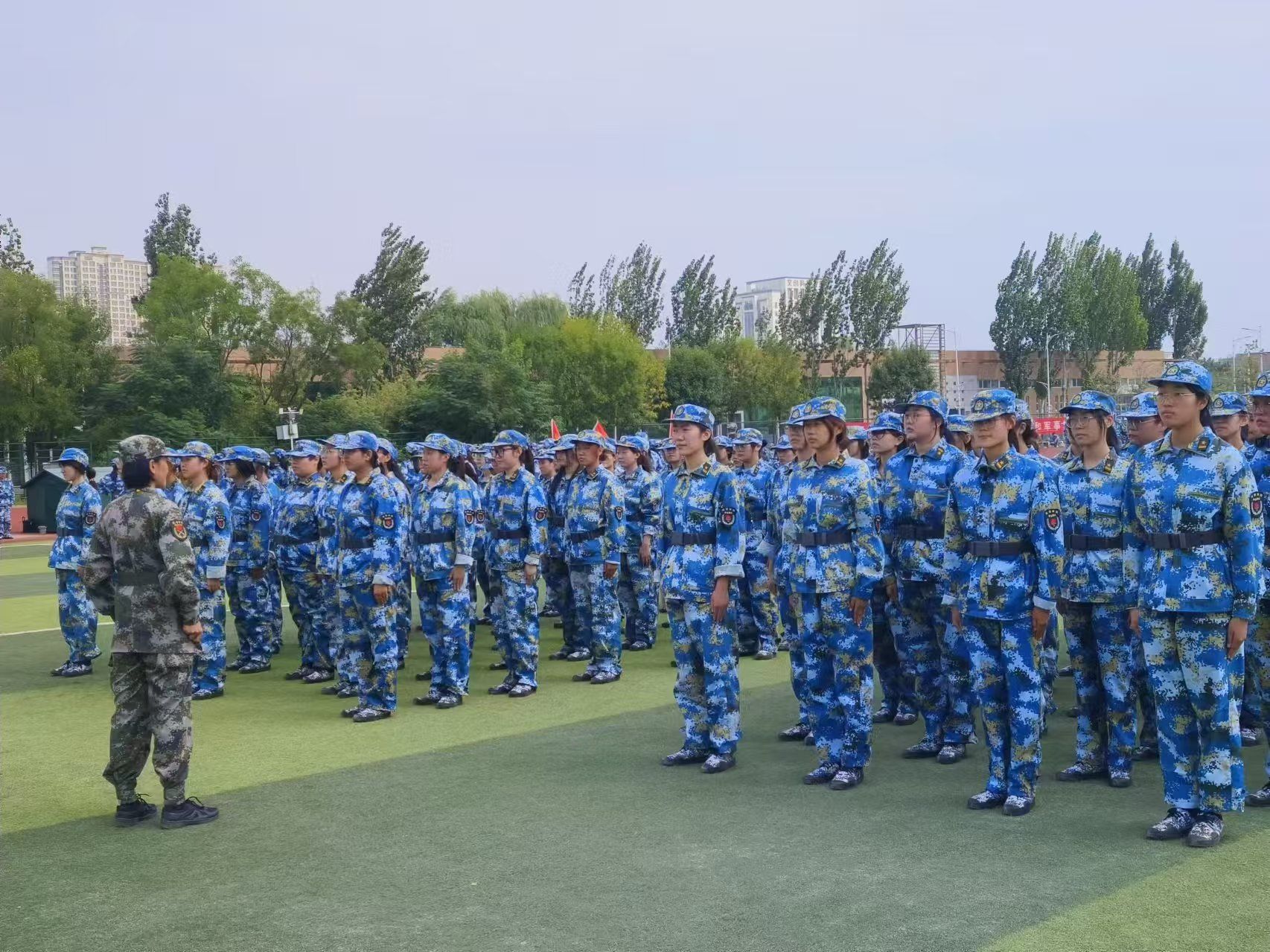 随着号角声音的响彻,学生们身着统一的迷彩服,在操场上迅速集结。教官身姿挺拔,立于队列前方,目光炯炯,严格审视每一位学生的着装与队列排列。随着一声声响亮的命令,队伍即刻变得井然有序,学生们昂首挺胸,目光直视前方,彰显出了他们优良的精神状态。