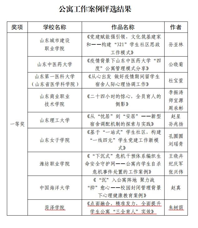 喜报|我院朱树荫老师荣获山东省公寓工作案例一等奖
